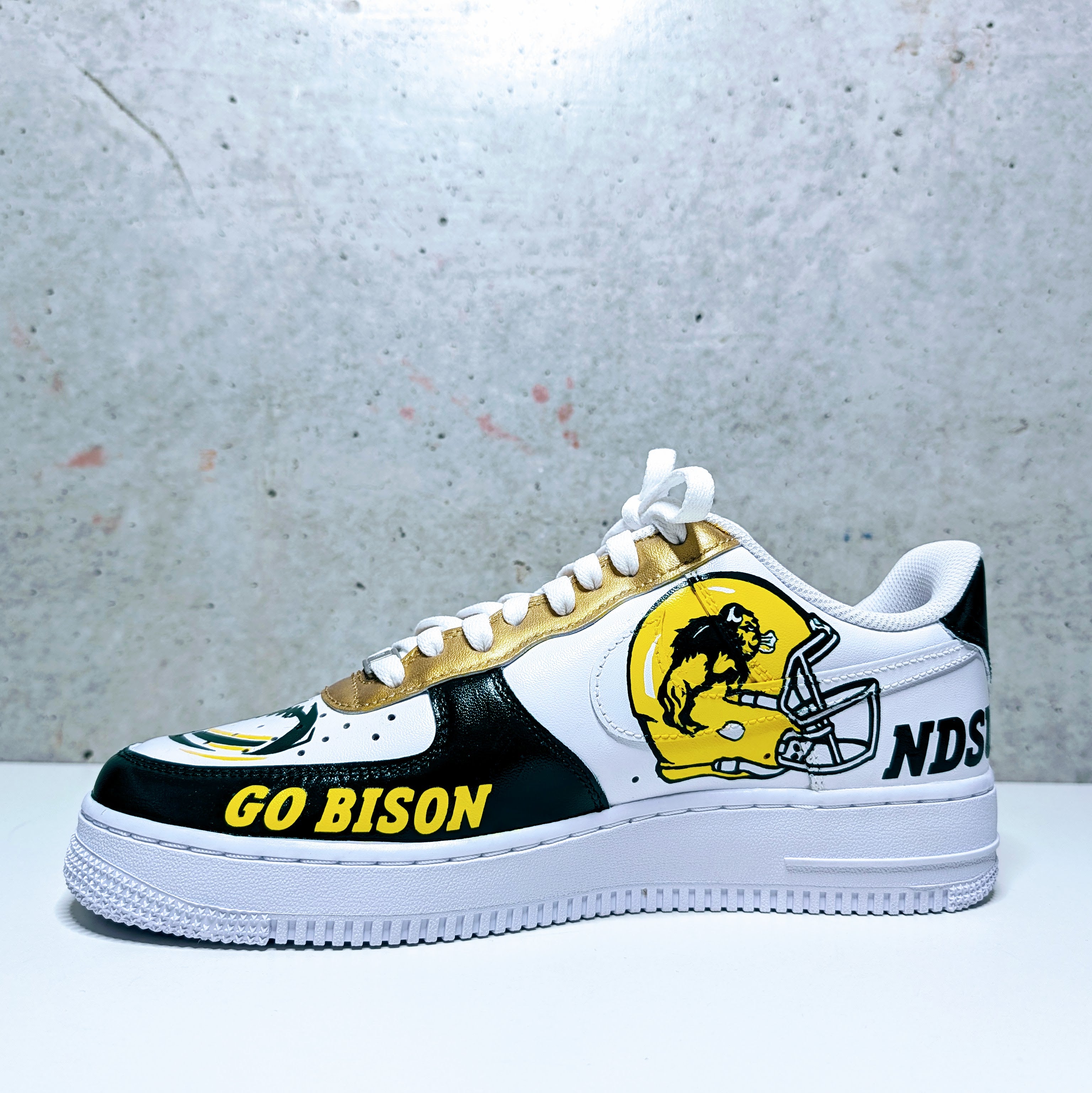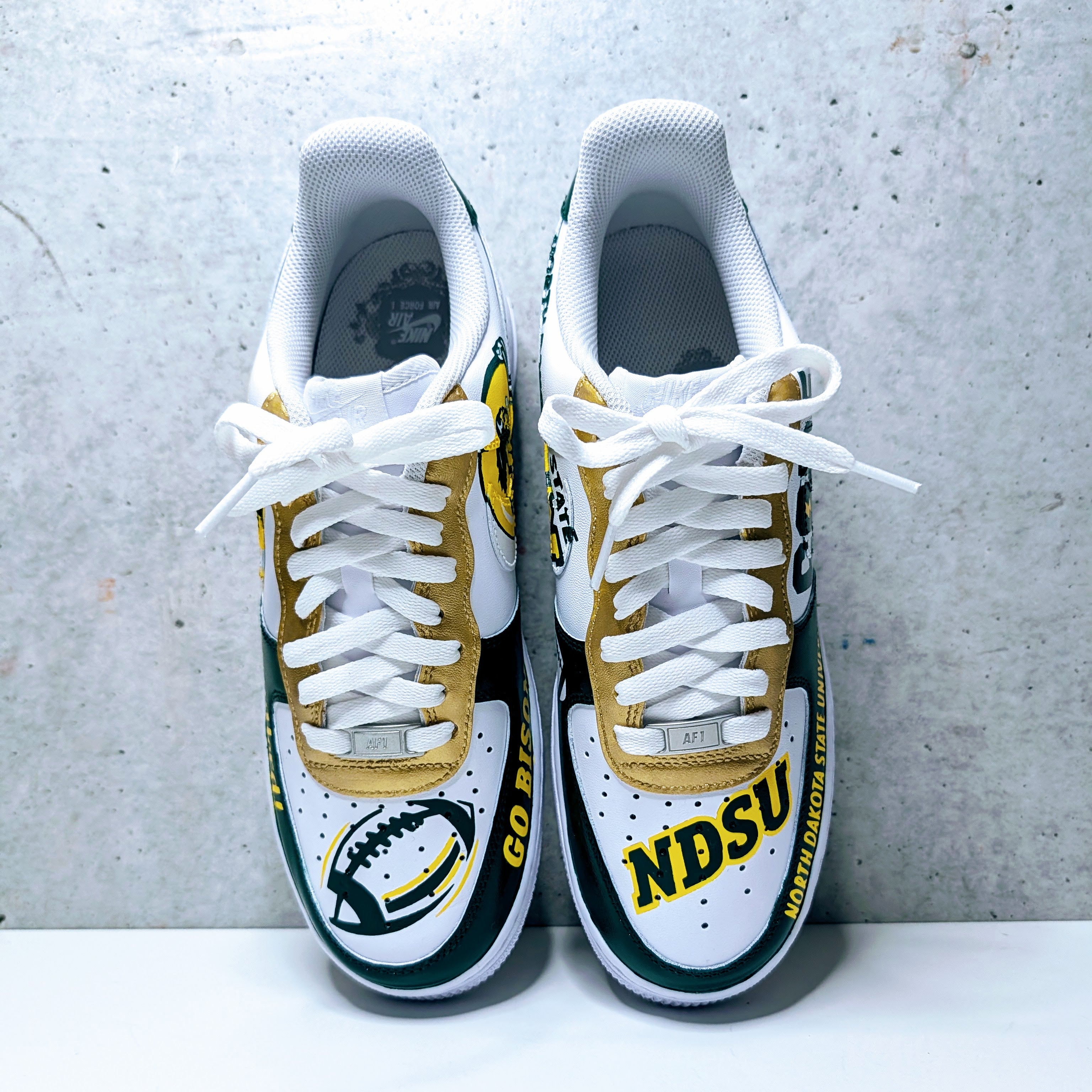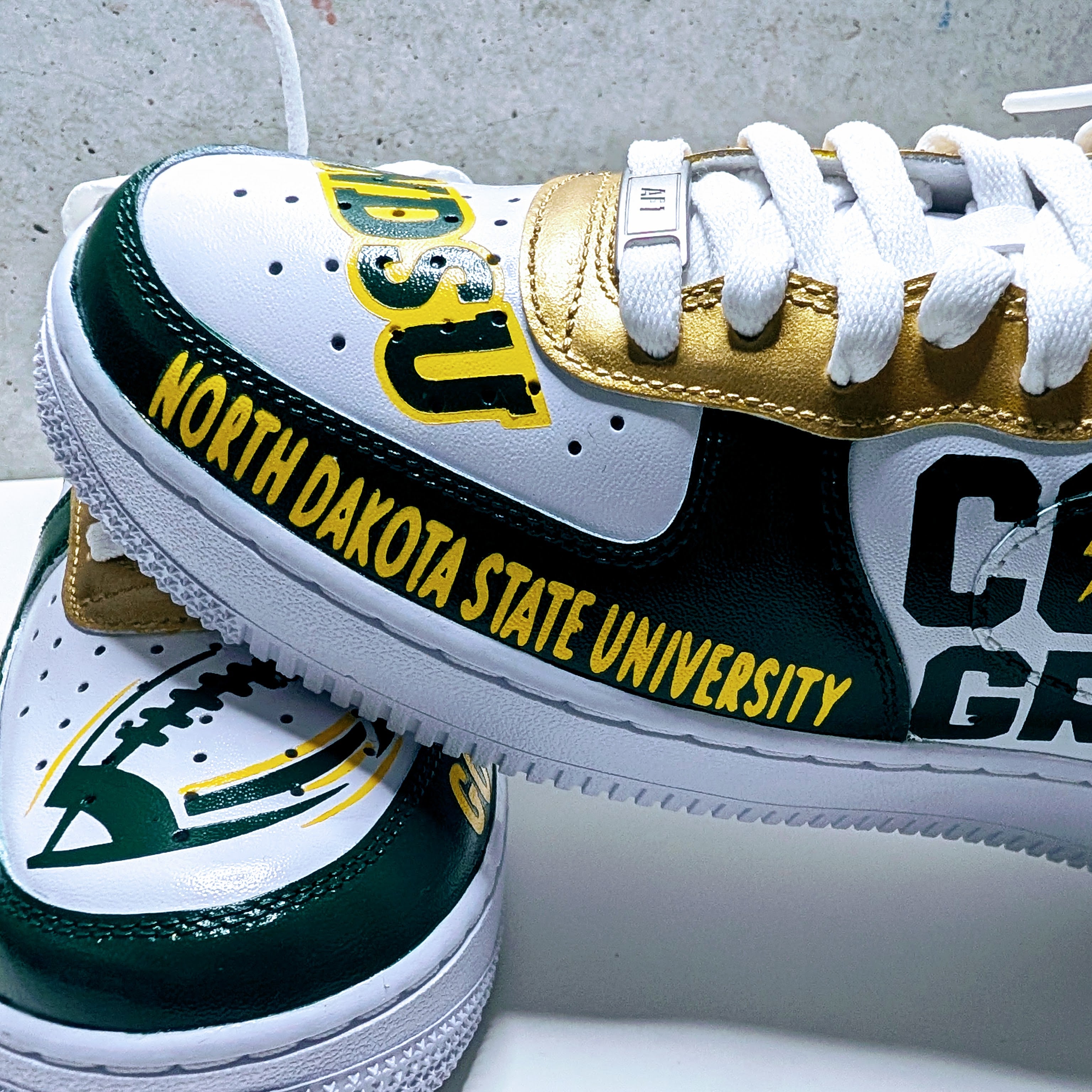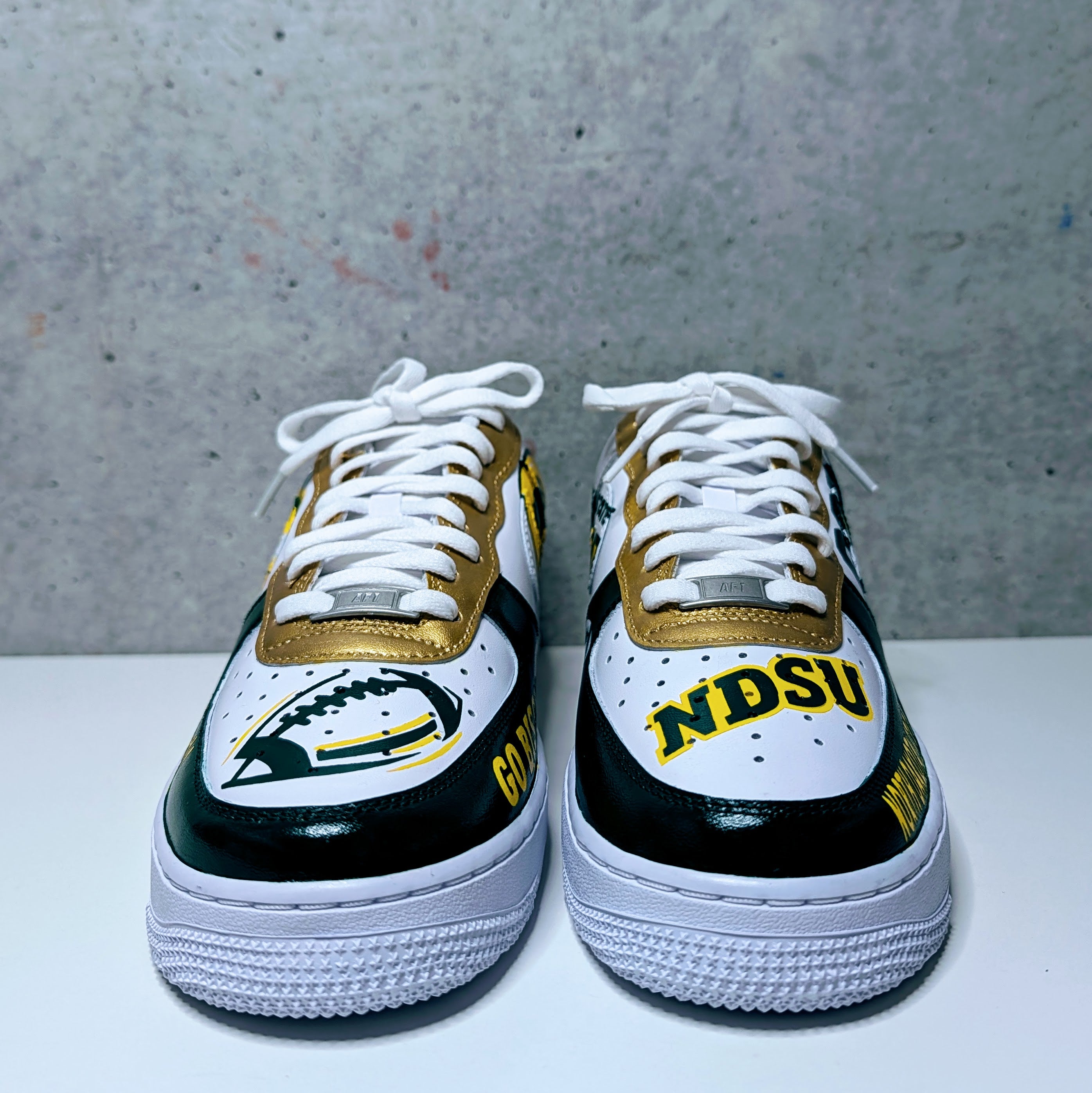 Elevate your gameday attire with these exclusive, custom painted Nike Air Force 1 sneakers designed for the ultimate North Dakota State University fan. Unlike standard collegiate gear, this design goes beyond the basic Green and Yellow. This commissioned pair features striking metallic gold accents, celebrating the championship pedigree of the Bison in a premium, wearable format.