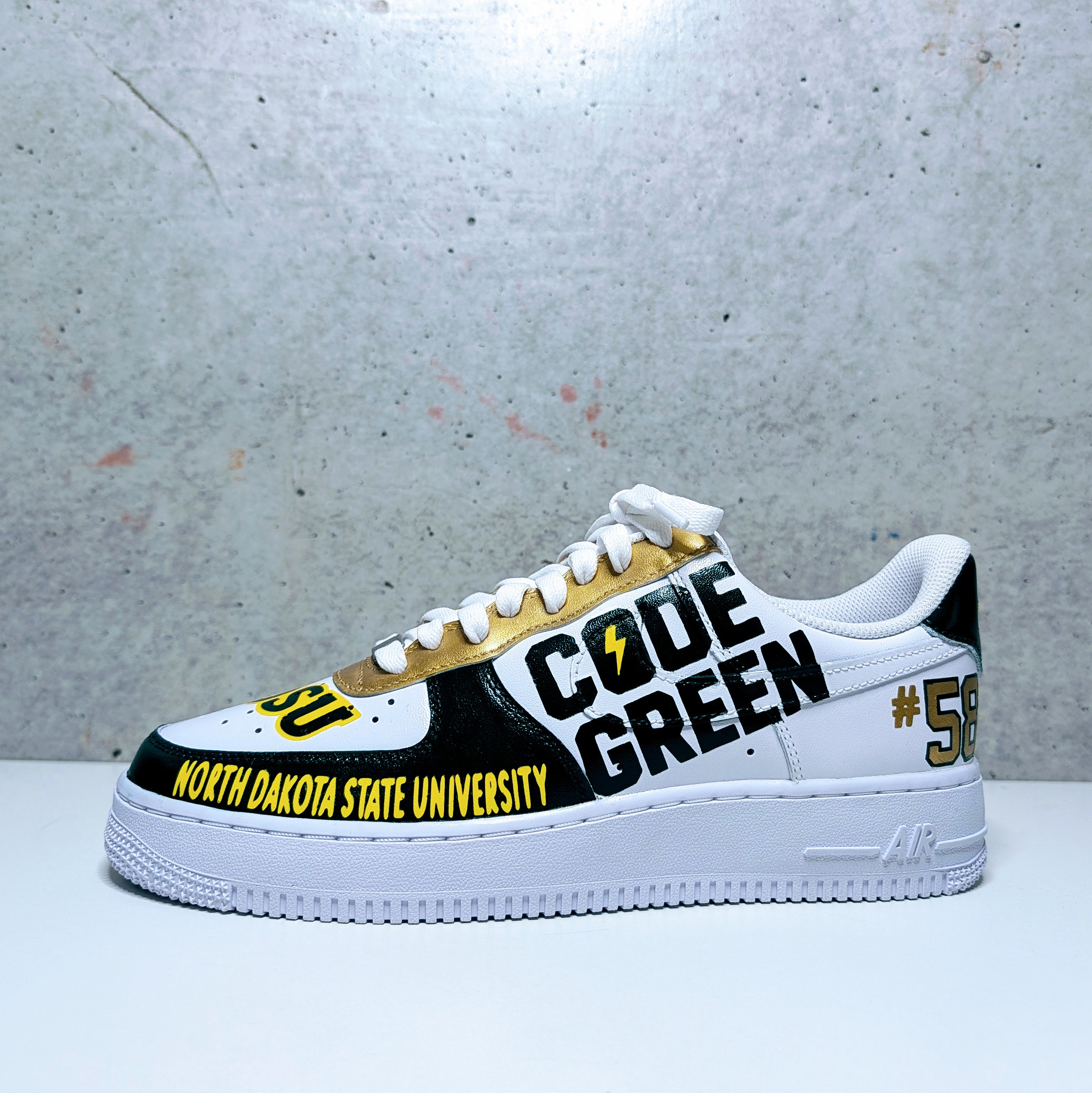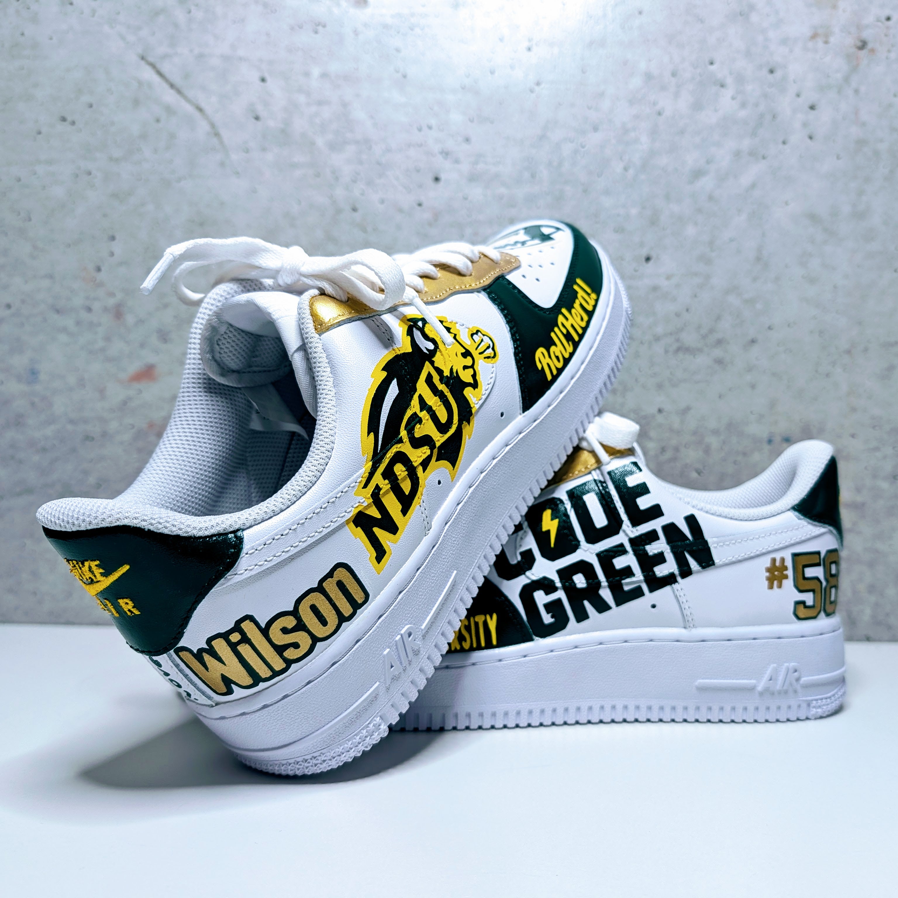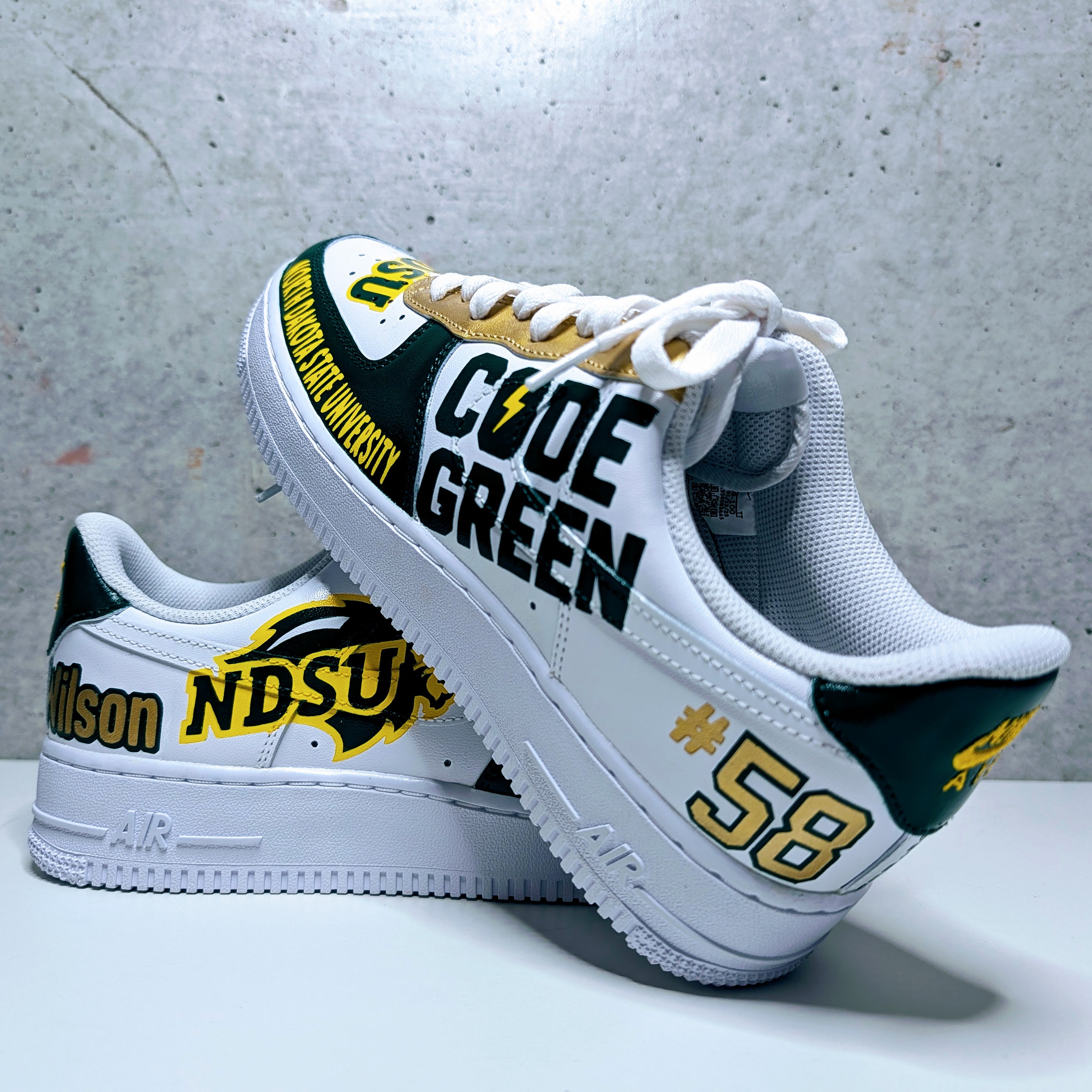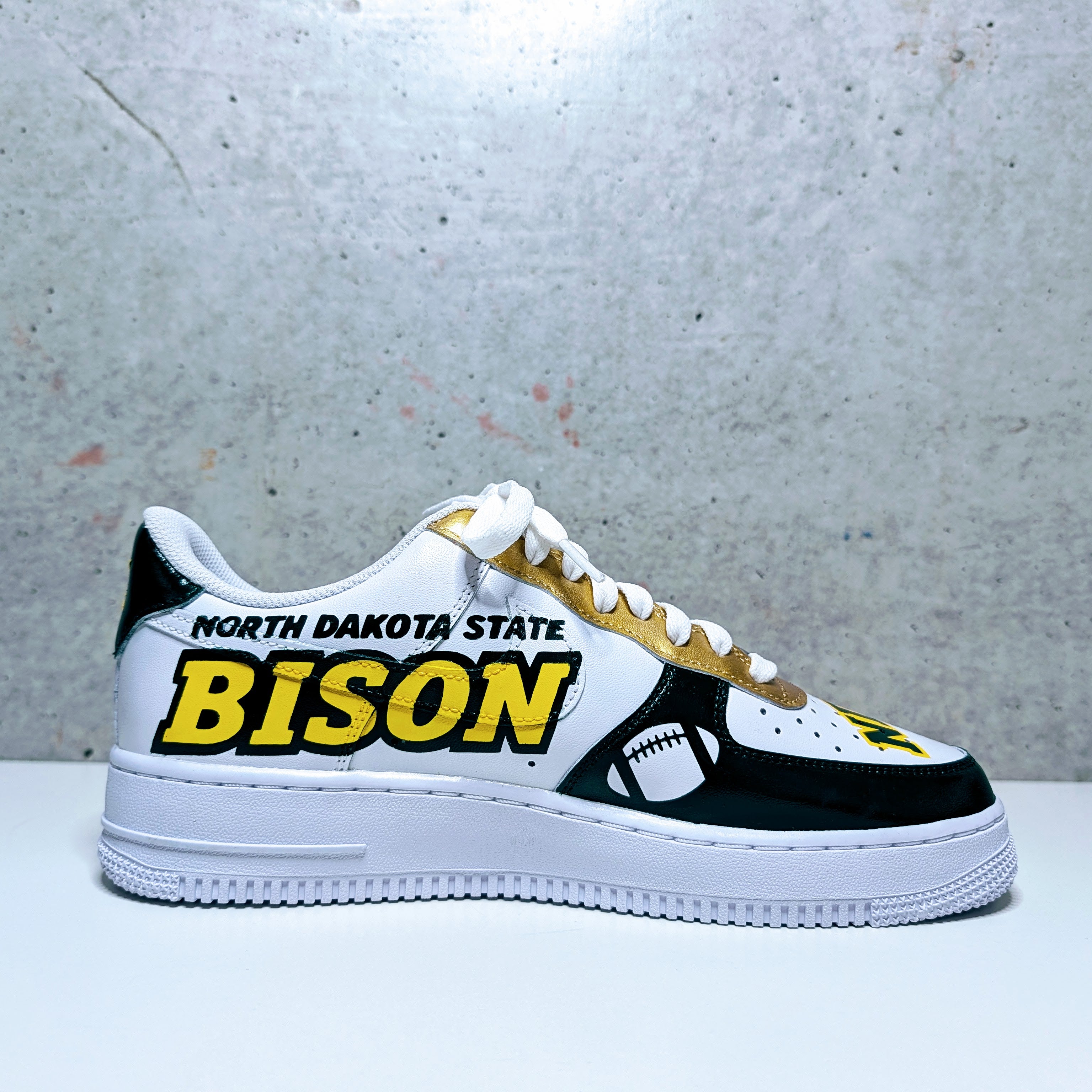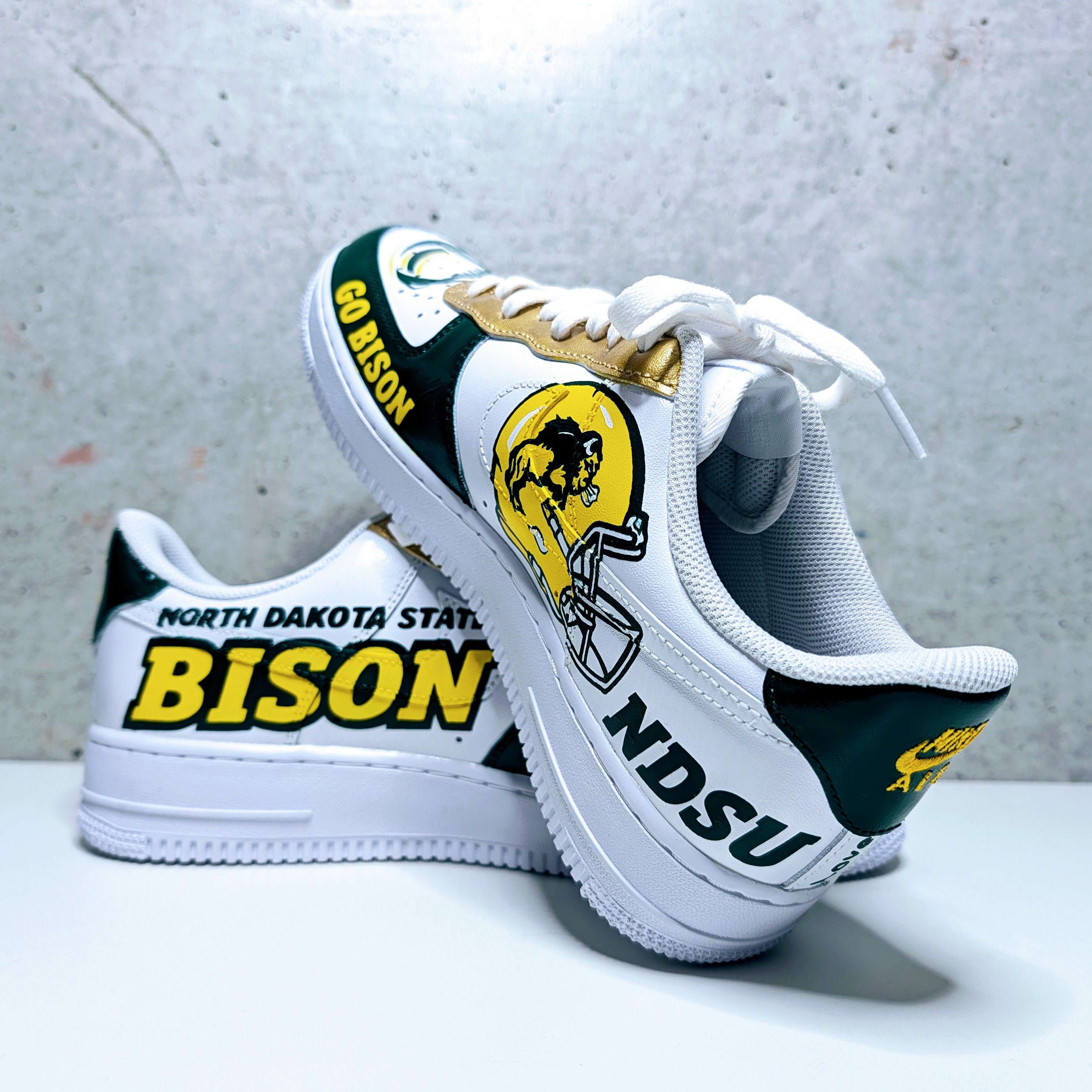 Elevate your gameday attire with these exclusive, custom painted Nike Air Force 1 sneakers designed for the ultimate North Dakota State University fan. Unlike standard collegiate gear, this design goes beyond the basic Green and Yellow. This commissioned pair features striking metallic gold accents, celebrating the championship pedigree of the Bison in a premium, wearable format.