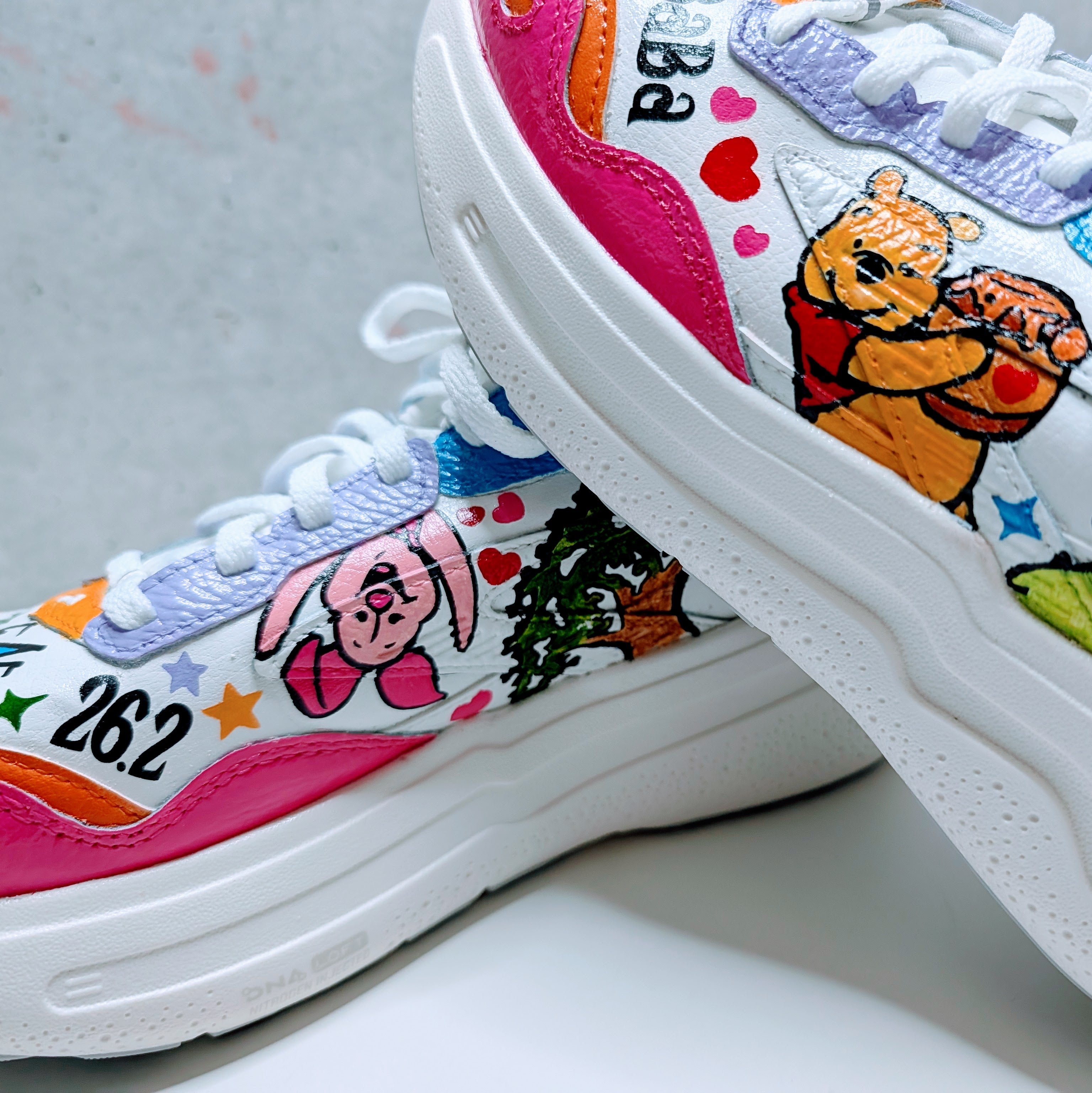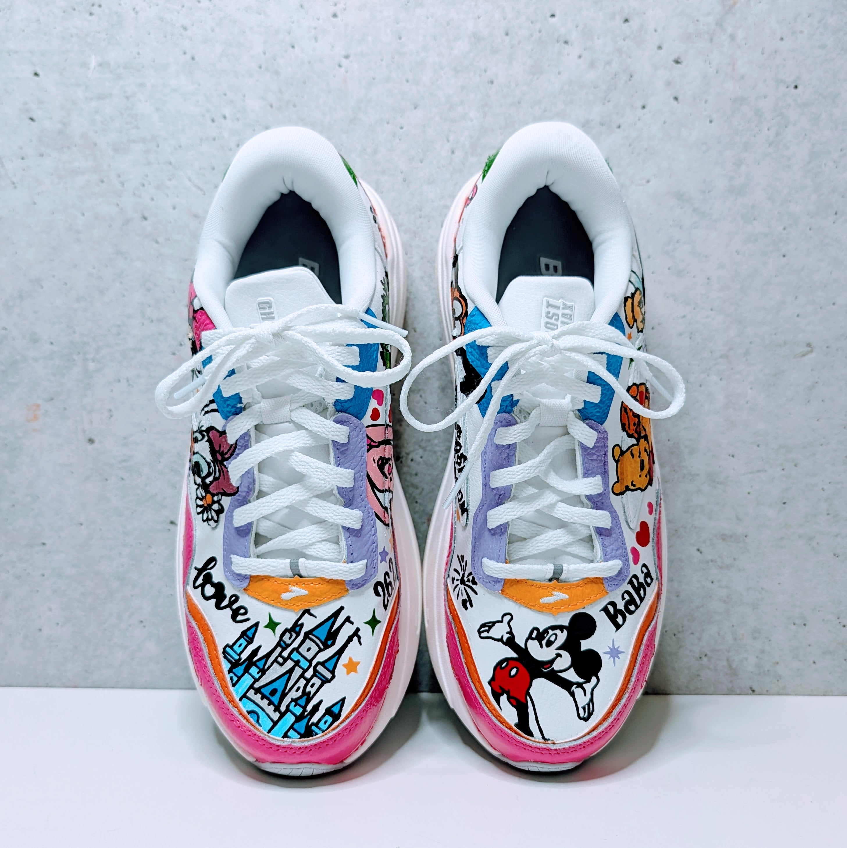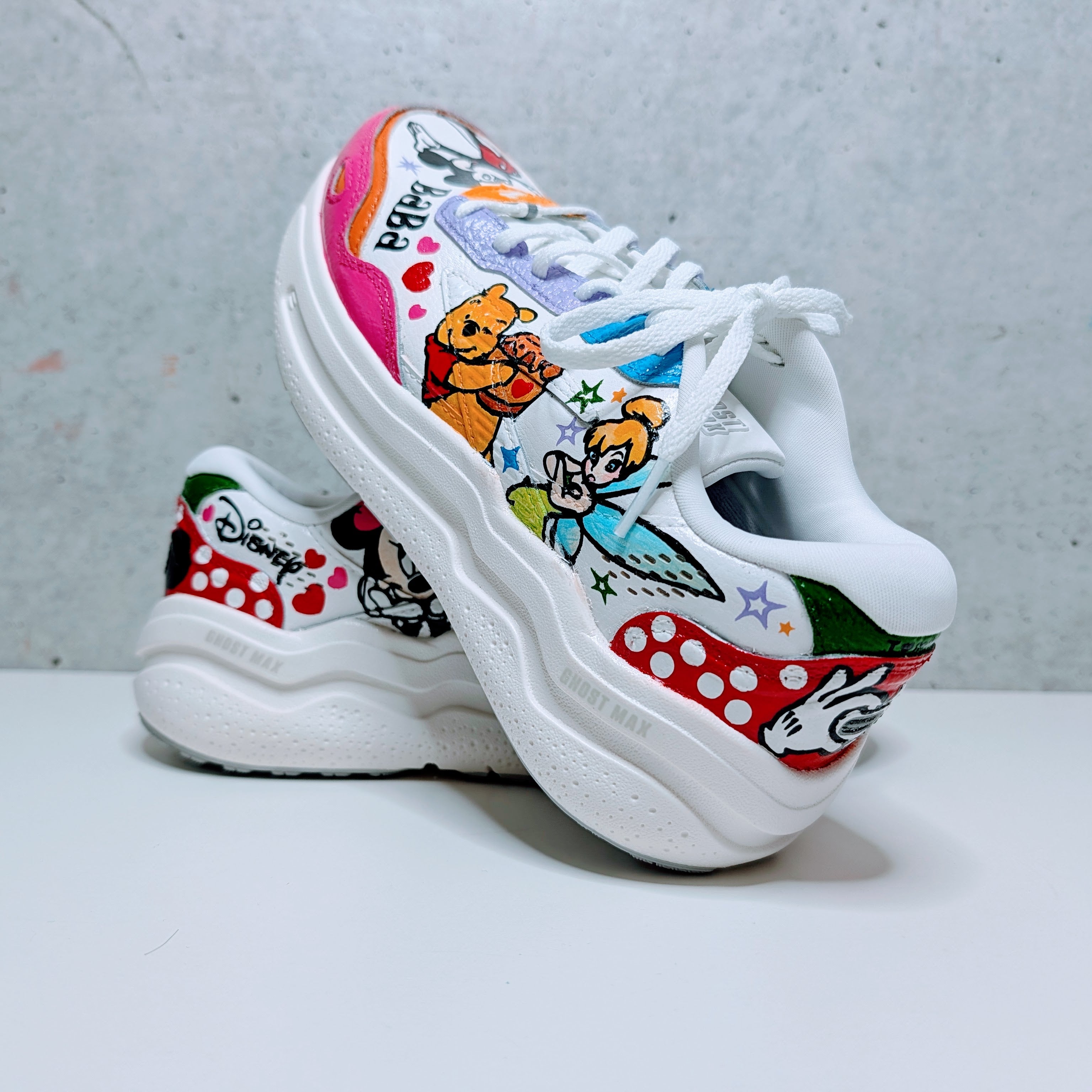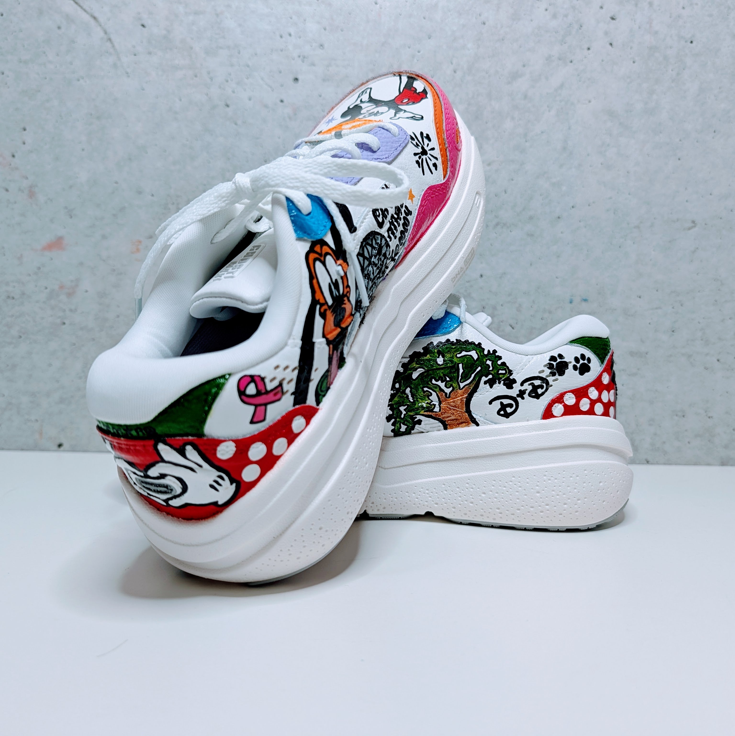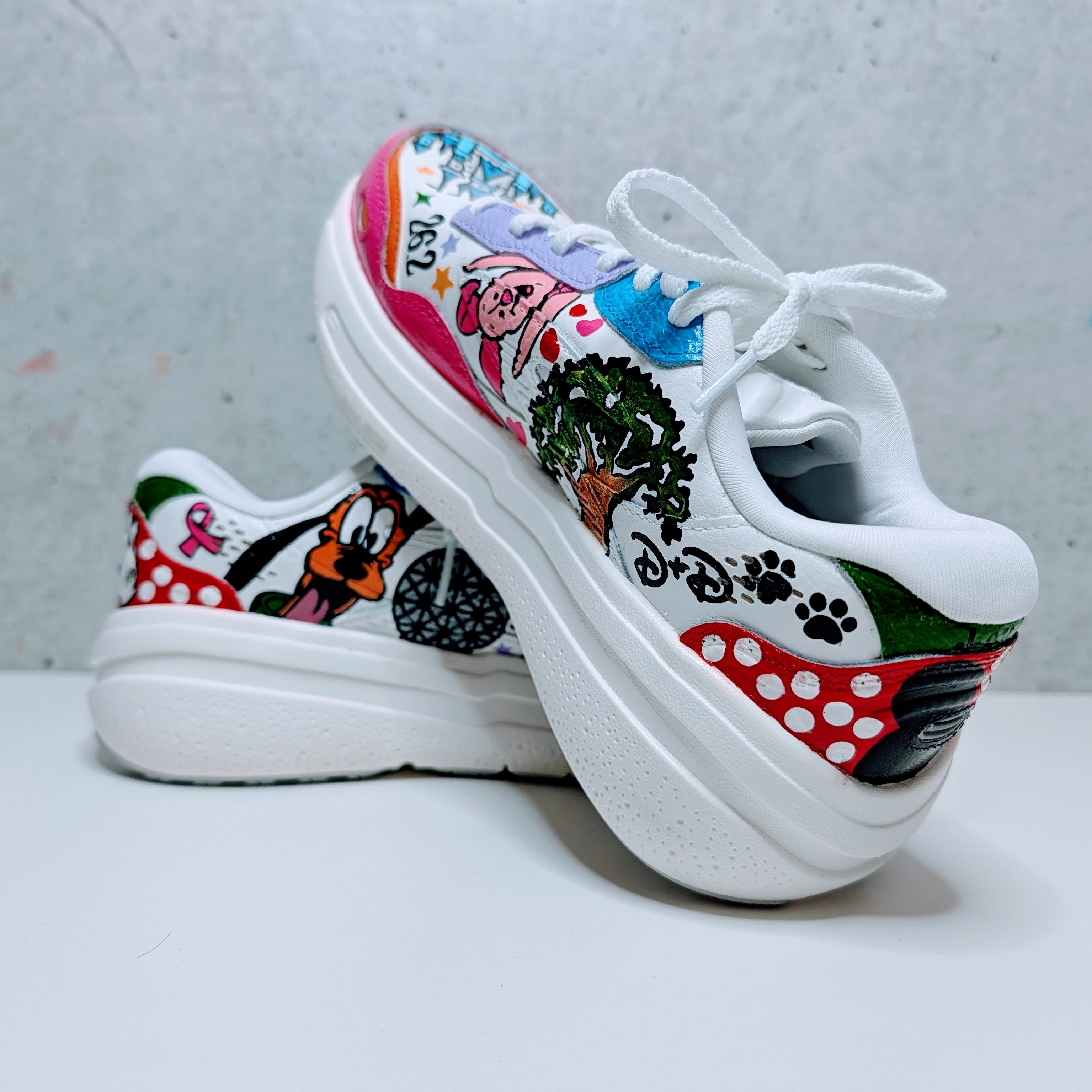We transform these ultra-cushioned walking shoes into a wearable work of art using premium Angelus paints. Say goodbye to boring white walking shoes and hello to a vibrant tribute to the mouse, the princesses, or the villains you love most.